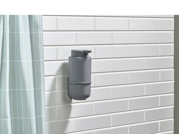 Vægmonteret holder i pulverlakeret metal. Shampooflasker forsvinder fra gulvet i brusenichen, og der bliver mere plads på toiletbordet. Holderen passer til både tandbørstekrus og sæbedispenser i to størrelser i Zone Denmarks badserie Ume.